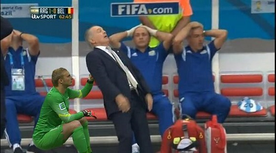 Alejandro Sabella kippt und droht zu fallen, doch Hollands Torwart Cillessen hat noch ein bisschen Zeit für eine helfende Hand…